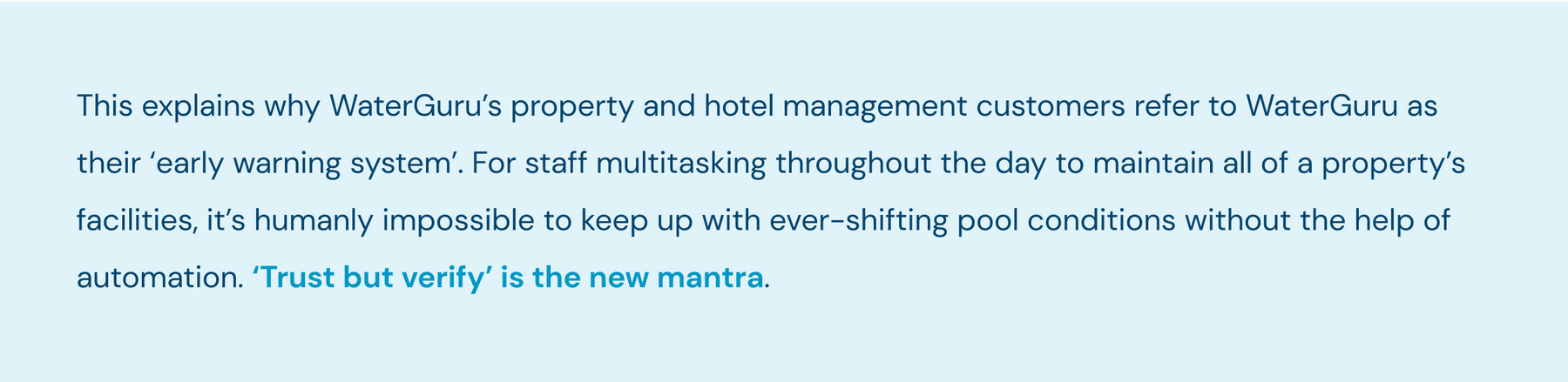 Nevertheless, that’s what pool maintenance staff rely on every day. When chlorine levels exceed chemical test upper measurement limits, a common occurrence, these widely relied upon tests using DPD chemical dyes begin to fade out around 10 PPM. When a hotel’s pool chlorine levels reach dangerous levels like 15 or 20 PPM; maintenance staff are operating completely in the dark. It’s the classic case of - you can’t manage what you can’t measure!